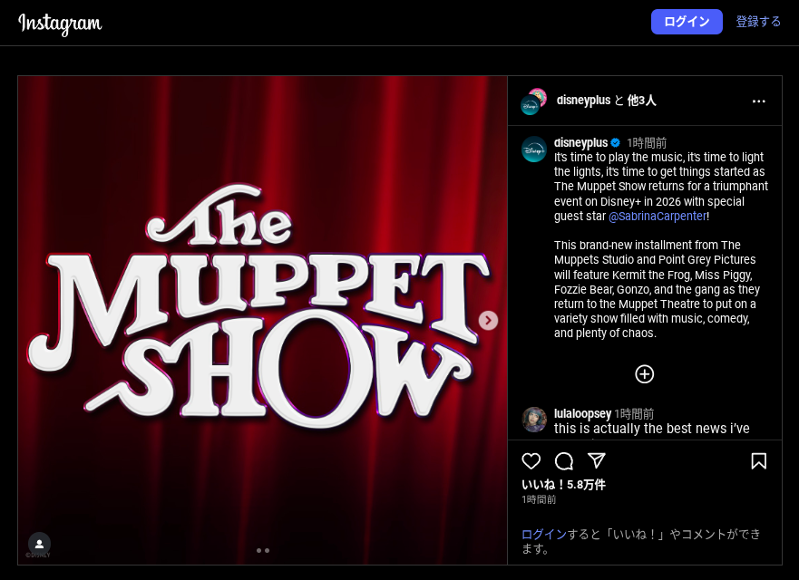 Disney+の公式SNSアカウントでは、番組のテーマソングの一節「It’s time to play the music, it’s time to light the lights…」を引用し、2026年にDisney+で『マペット・ショー』が復活することが告知されています。マペット・シアターを思わせる赤いカーテンを背景にした『The Muppet Show』のロゴと、マペット・シアターの楽屋の写真(カーミットの名前が入ったマグカップと机)の画像も投稿されています。